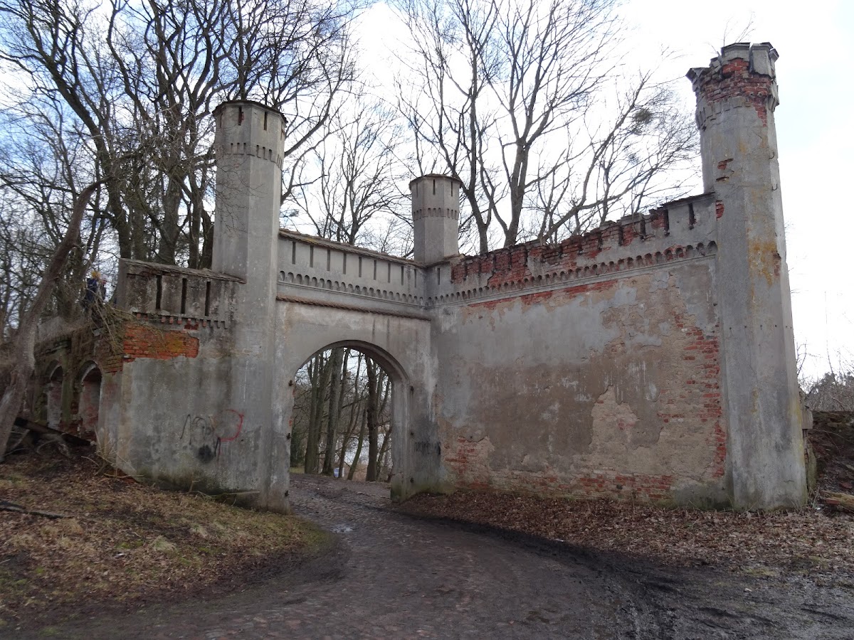 Полуразрушенный замок на холме в атмосферном заброшенном городке Железнодорожный.